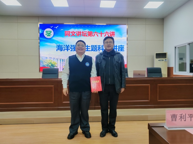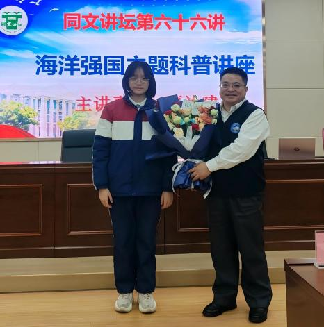 随后,严汝建一行来到九江同文中学。同文中学校长胡军为严汝建副校长颁发“同文讲坛”证书,学生代表献花。严汝建为同文中学师生做主题报告并寄语青年学子:“海洋强国的梦想必将由青年一代实现,欢迎有志投身强海报国的同学加入我们,在推进强国建设、民族复兴伟业中绽放青春光彩”,师生现场反响强烈。