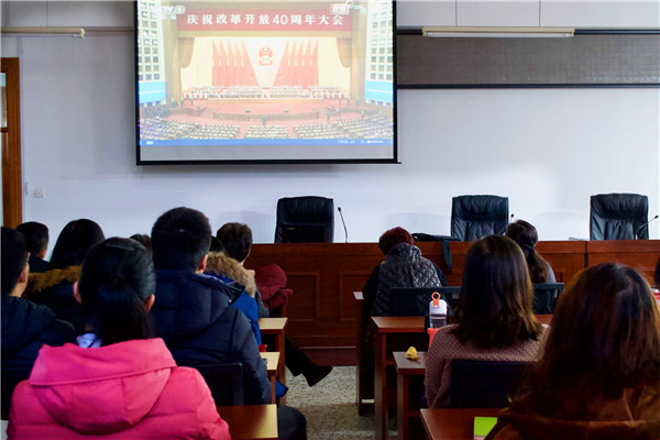 12月18日上午10时,PP电子官方网站于主楼420教室组织观看庆祝改革开放40周年大会直播。学院全体教师及本硕博优秀学生代表参加本次活动。